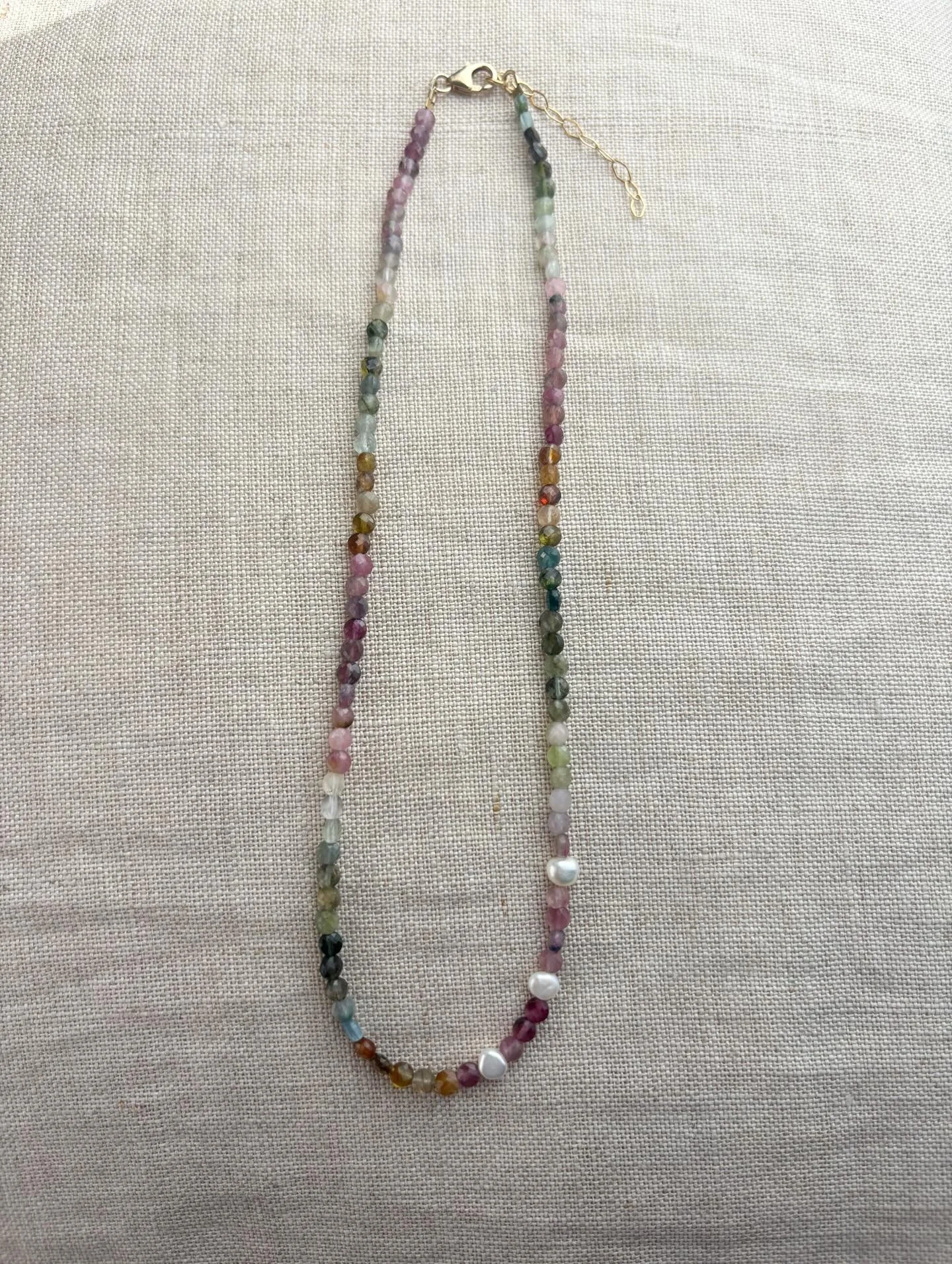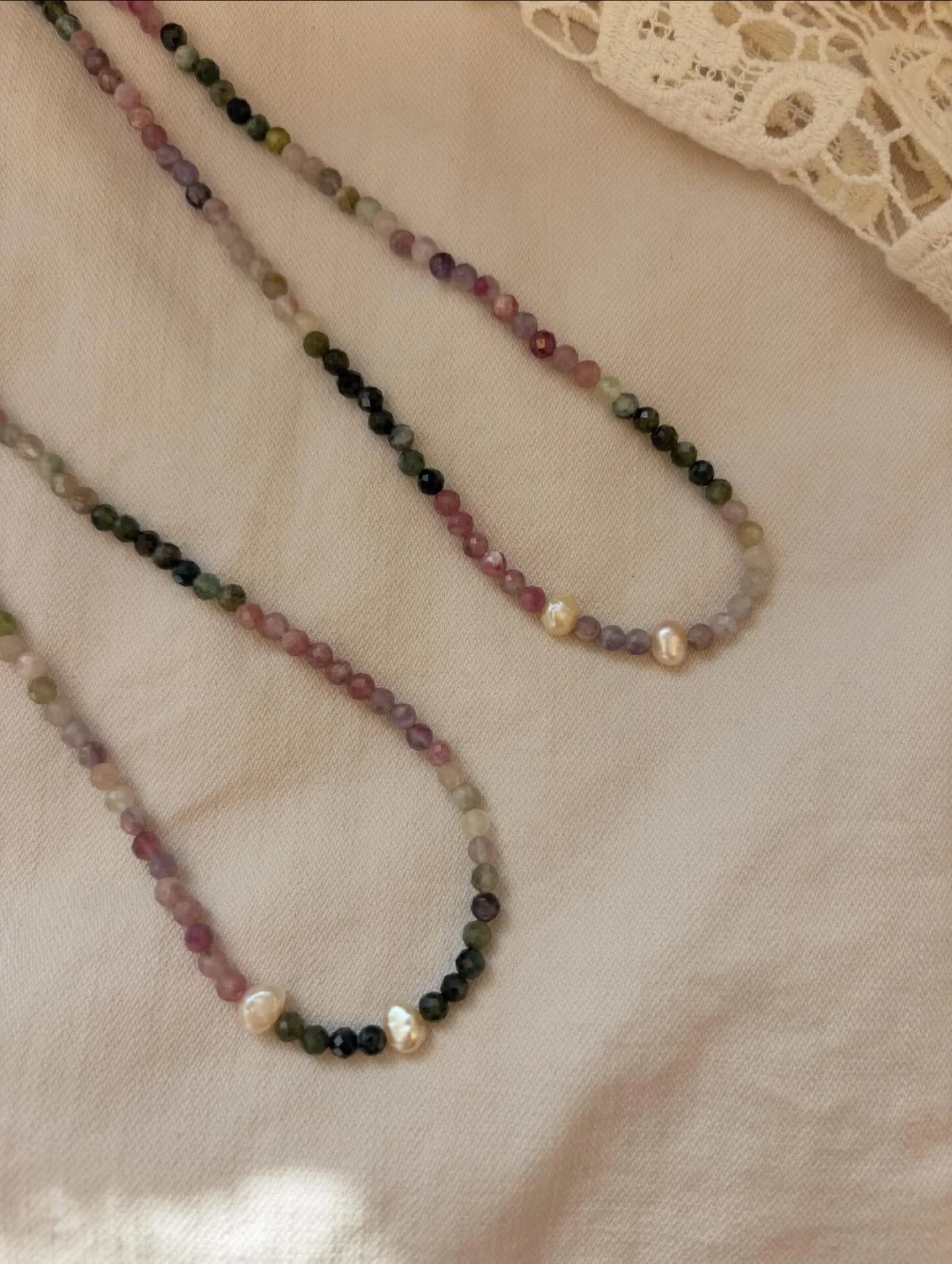 The Rainbow Tourmaline Necklace features a raw, faceted tourmaline that reveals soft flashes of pink, green, and golden tones — each stone uniquely alive with natural color. Rainbow tourmaline is known for its energy of balance and joy — a reminder of harmony found in life’s subtle shifts.